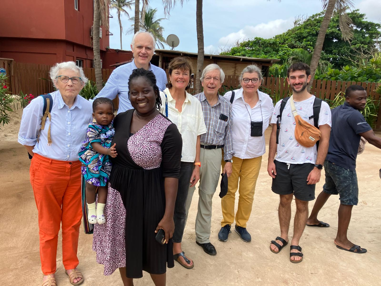 De gauche à droite: Marie-Noëlle Van Parijs, Robert De Jonghe, Béatrice Van Frachen, Xavier De Muylder, Christiner Markiewicz et Nader Wauters. Au premier rang: Afi Atsou, responsable administrative au Togo.